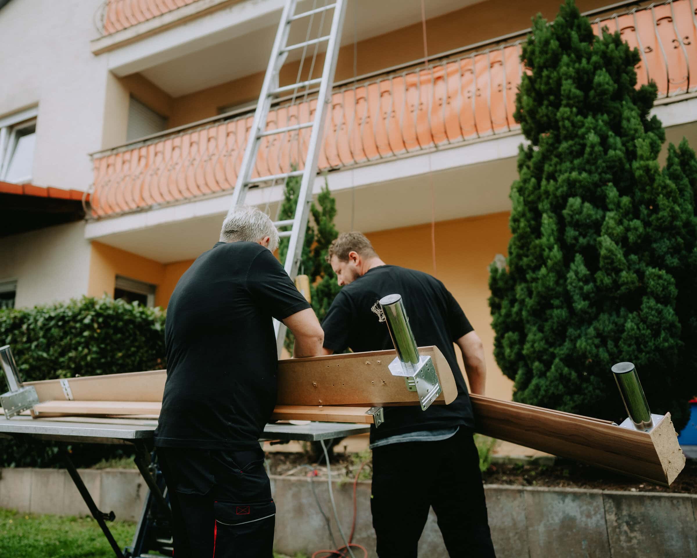 Unser Außenaufzug ist ein flexibles Leitersystem, das wir vor Ort individuell aufbauen und als Möbellift einsetzen. So erreichen wir auch höhere Etagen und transportieren Möbel direkt über Fenster oder Balkon.